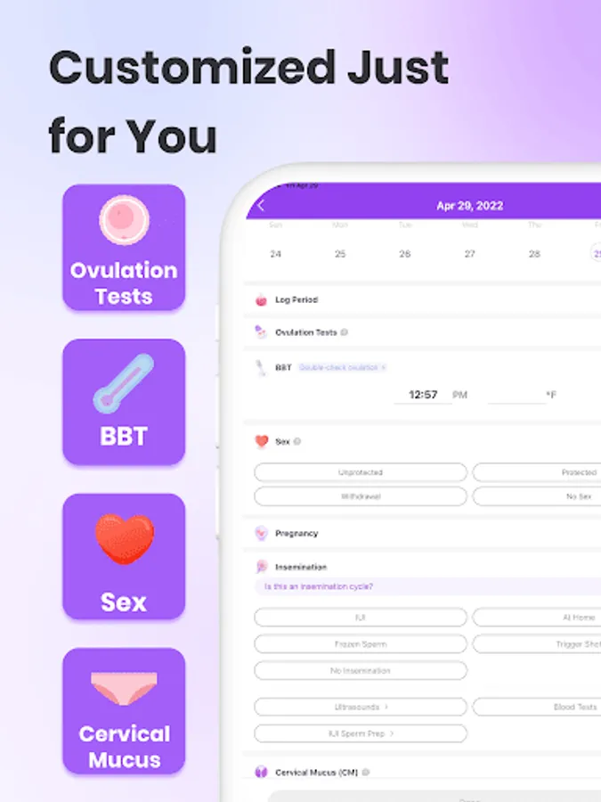 + Track your period, flow intensity, ovulation, fertile window, insemination, and cervical mucus with our period and ovulation tracker