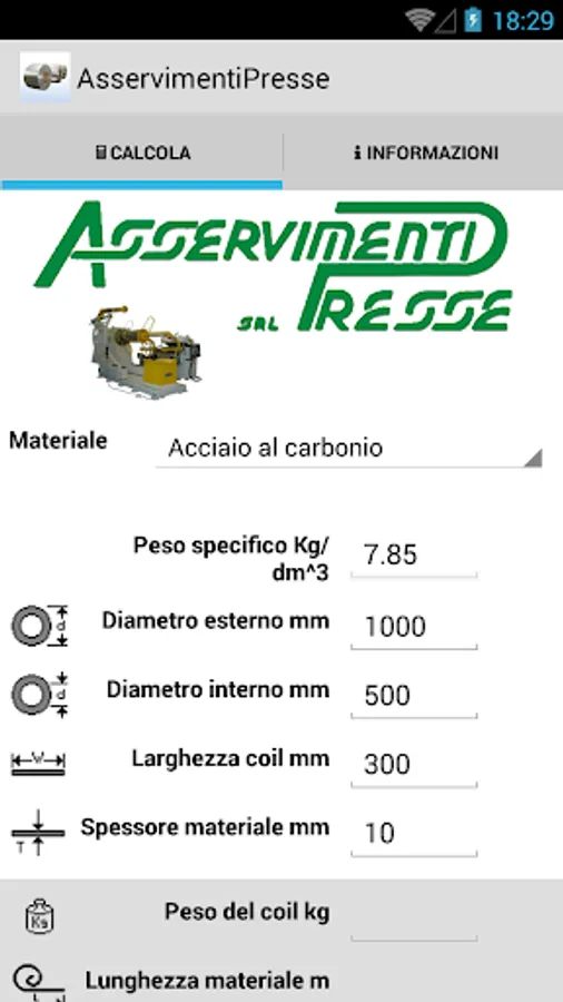 Filling in the worked material data such as: material type, width, thickness external and internal coil diameter, the program will provide you the coil weight (Kg) and the coil length (m)