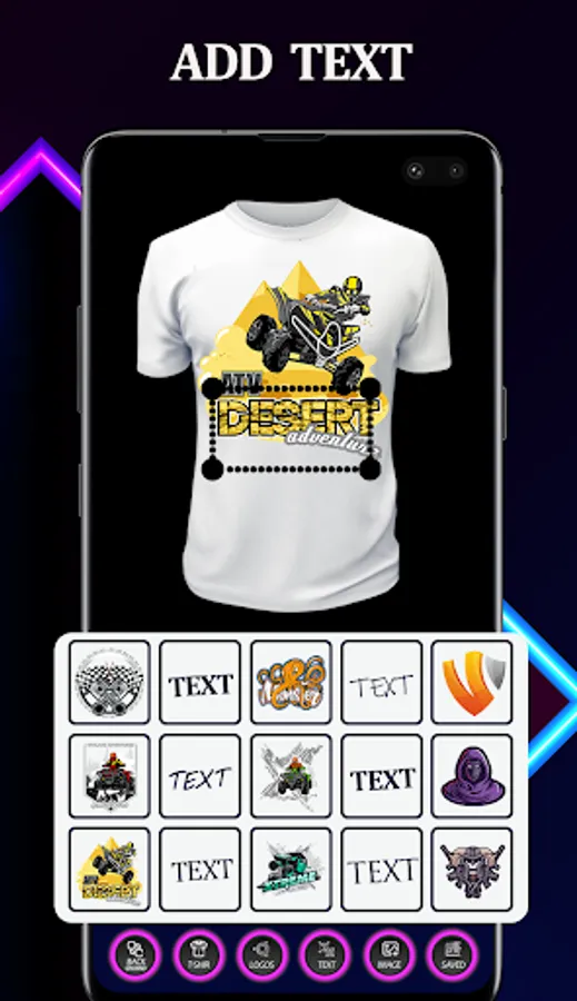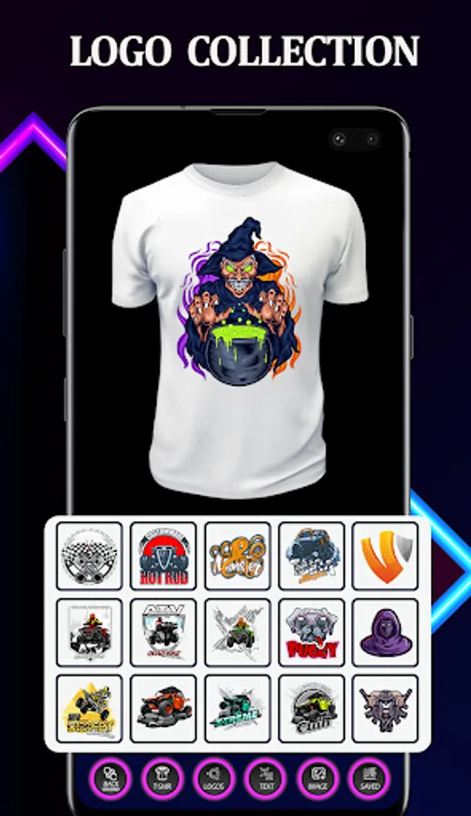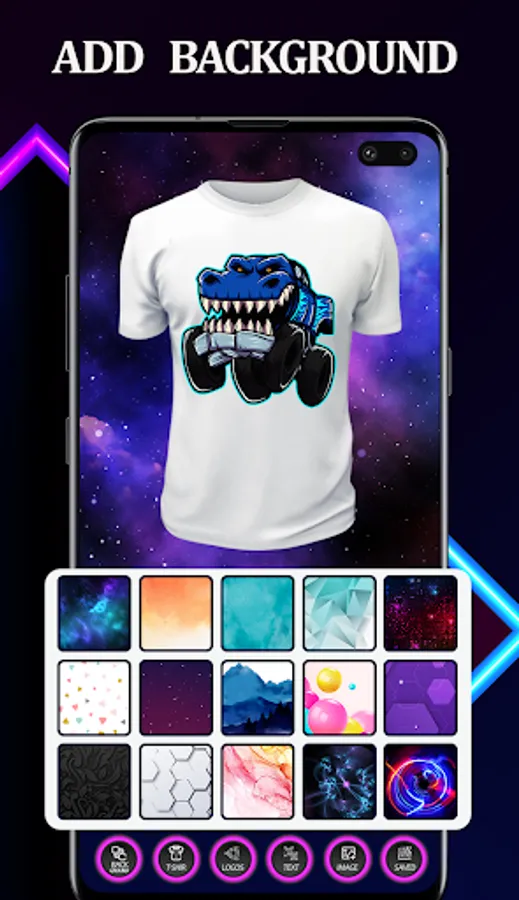 The T-shirt design studio app has a big collection of T-shirts, Logos, Backgrounds, Stickers, Colors & Textures.
