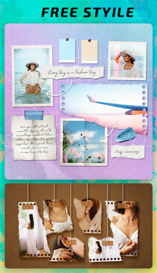 Select beautiful background with a full-screen ratio to create a scrapbook. You can decorate with pictures, stickers, texts, and doodles, and share your scrapbook to Instagram Stories and Snap chat Stories.