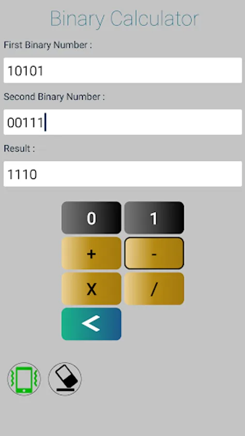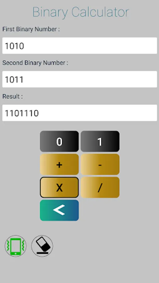 Type your two binary values, choose your operation (add or subtract or divide or multiply) and get the result, it's fast and easy to use.