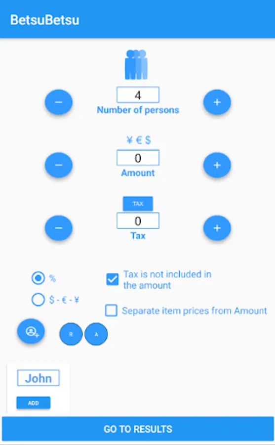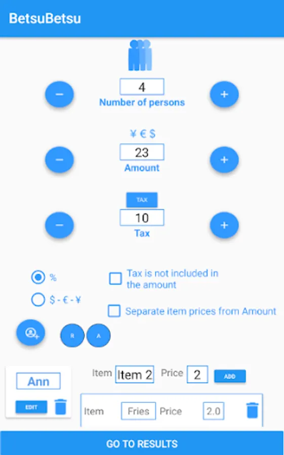 BetsuBetsu is an app that allows you to split a bill among any number of persons in a quick and easy way.