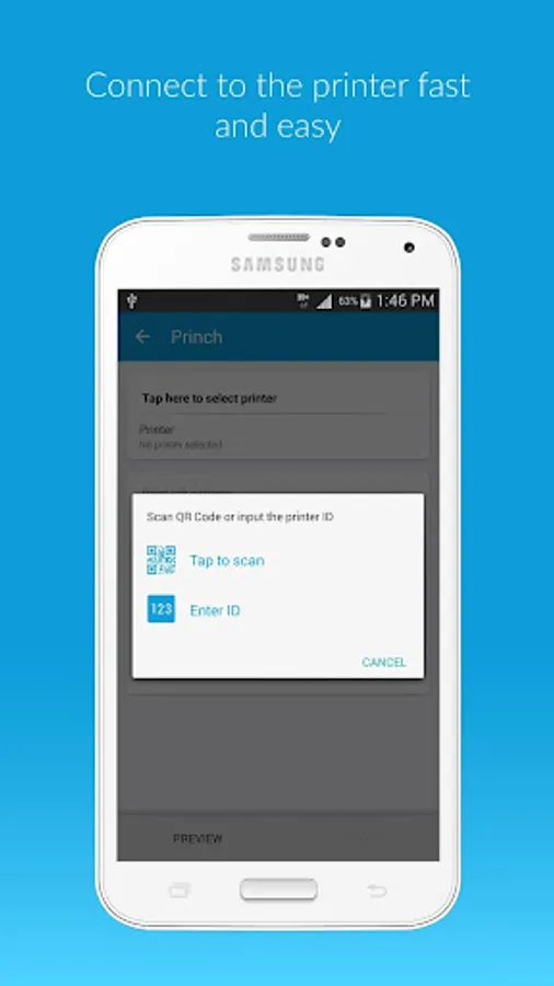 - Select the printer either by typing in the printer ID or by scanning the QR code by the printer.