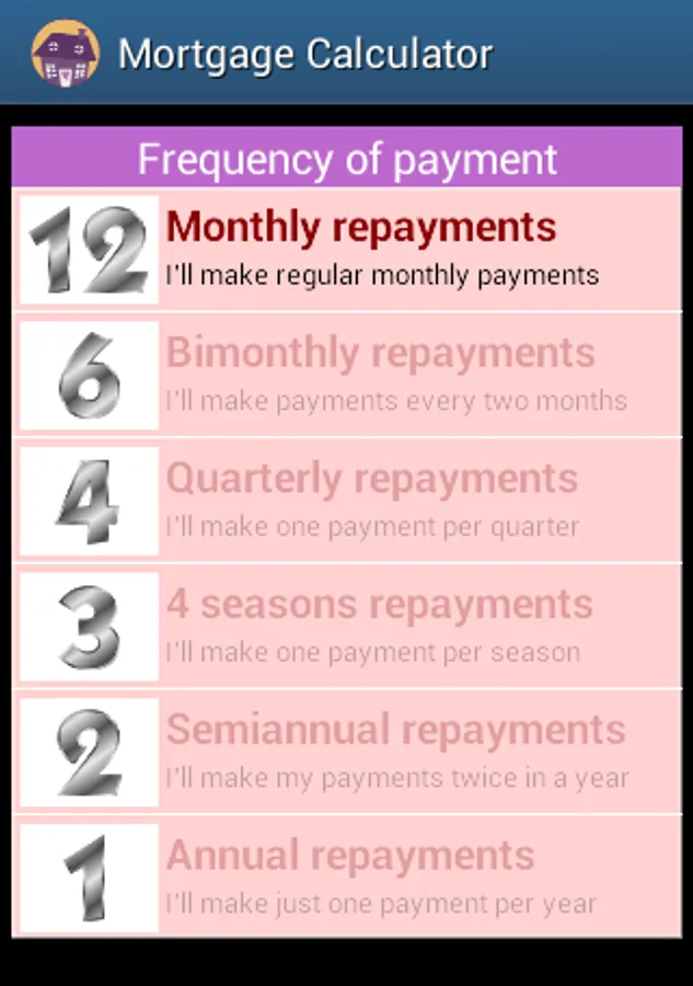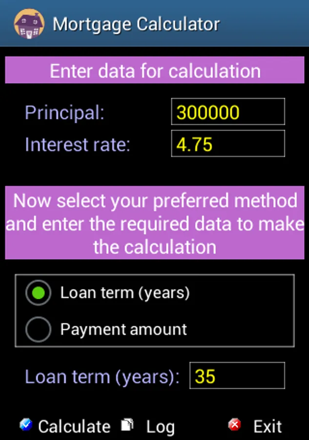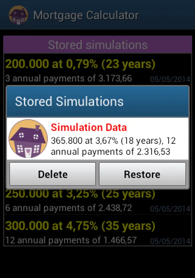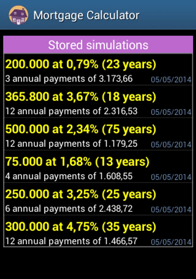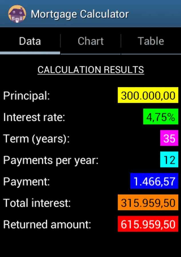 Simple application to calculate a mortgage loan costs. It allows you to make the calculation either by term or by fee and shows the interest vs amortization chart and the complete depreciation table. The application automatically stores all your simulation exercises and allows you to easily make comparisons among the results from having taken different assumptions. This calculator also gives you the opportunity to choose among several rates of payment apart from the usual frequency set on a monthly basis. Very simple use. For all types of users.