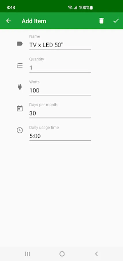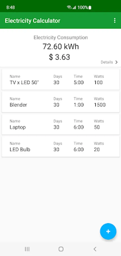 Electricity Calculator helps you to calculate the monthly electricity consumption of your home. Easily add your home appliances and devices or pick them from the list of samples.