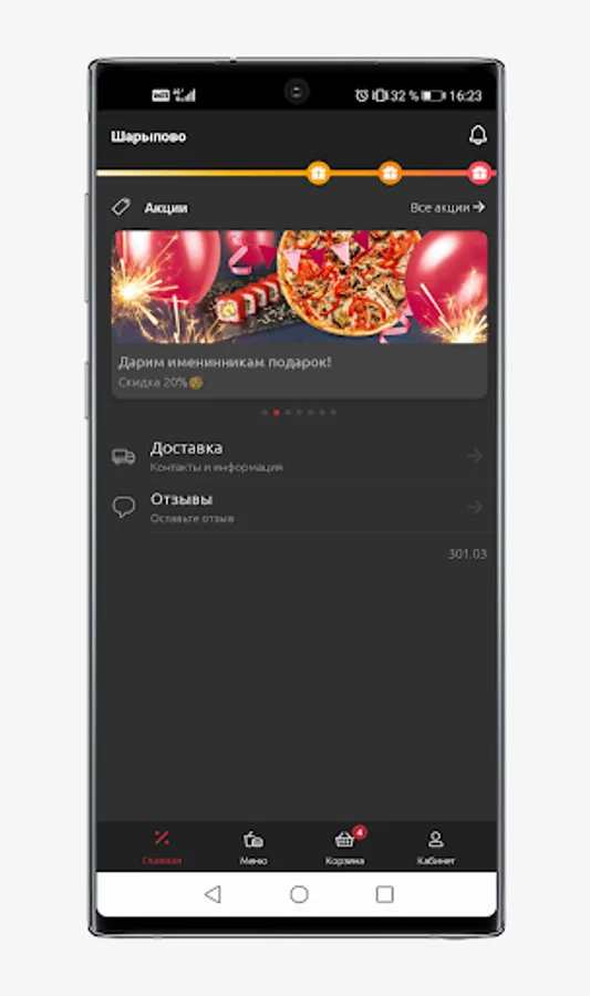 Just a few simple steps and you will enjoy delicious meals in a short time. Upon reaching the minimum order amount (from 400 rubles for the city), delivery will be free. In Cherry, promotions are often held, with which you can get good discounts and bonuses.