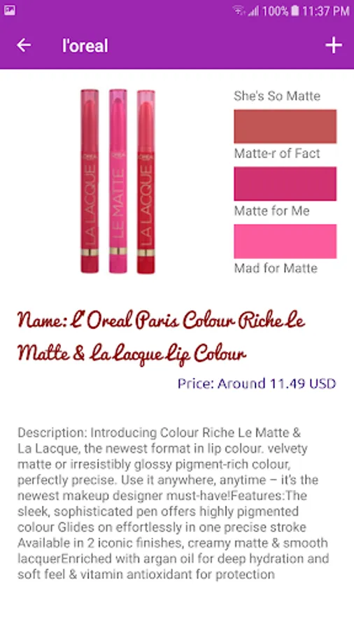 This app can store your favorite makeups for future use. Save and show the makeups' info and price to your friends or relatives.