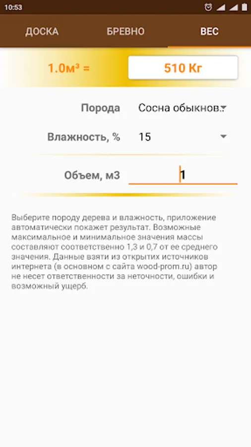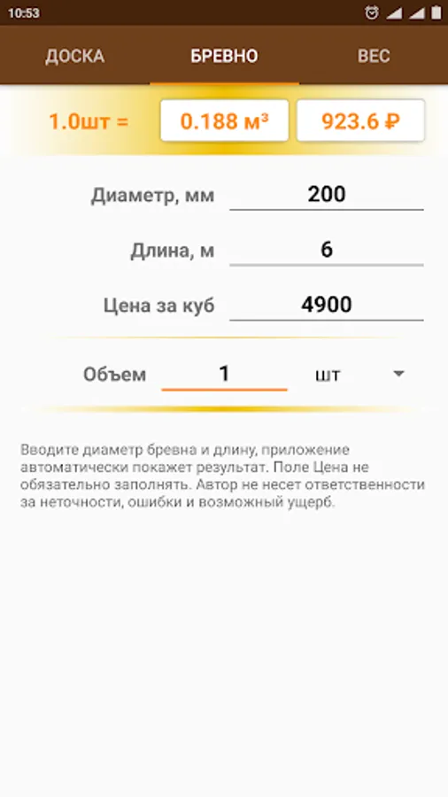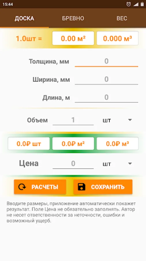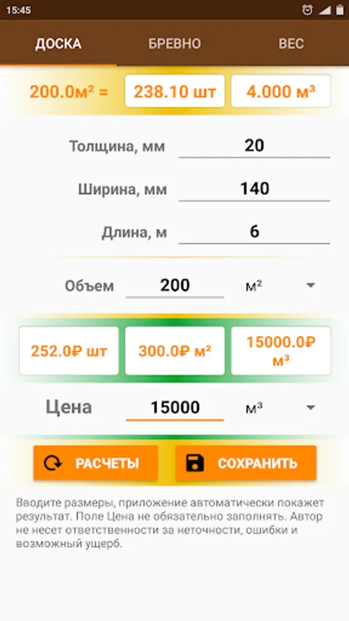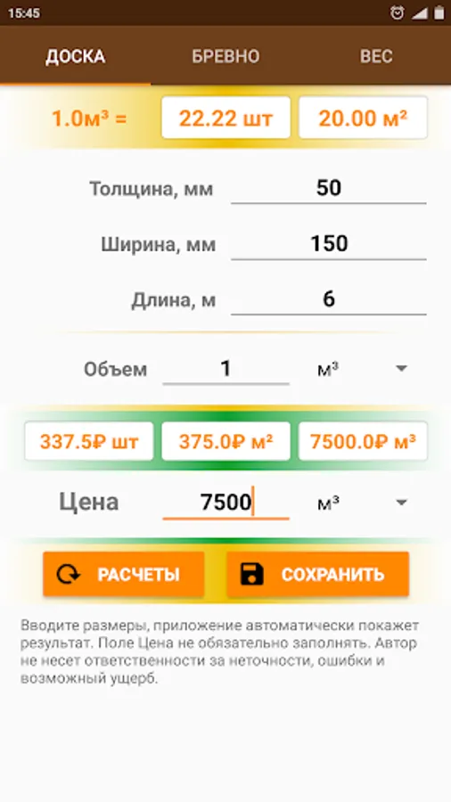 Also with the app can help to know the price for one board, for a square meter or cubic meter once, specifying only one of them.
