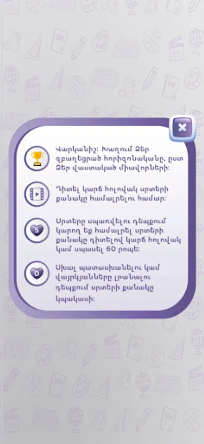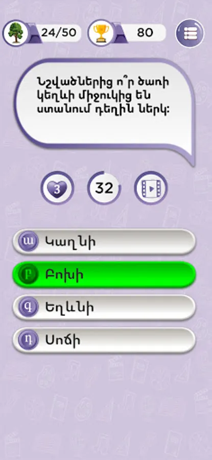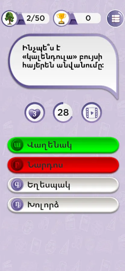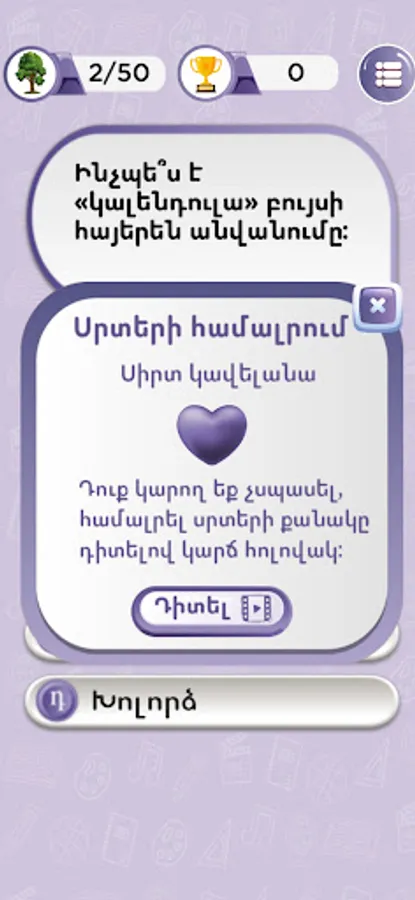 Ելու If you answer incorrectly or the seconds expire, you will lose heart. You can increase the number of hearts by watching a short video.