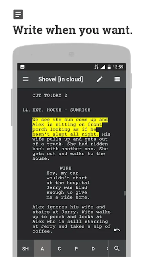 • export notes and scripts to pdf, fdx, fountain docx and kitsp formats in any of the installed applications (mail, Dropbox, Google Drive etc.).