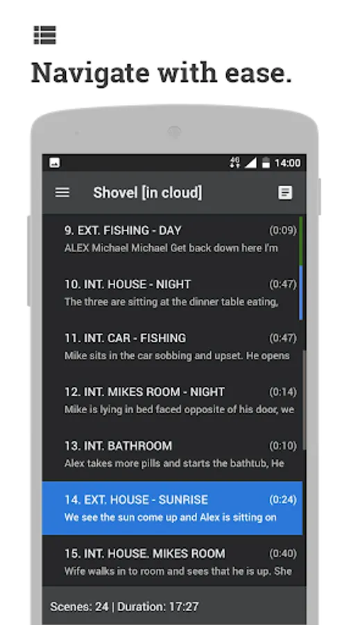 • import scripts from the formats fdx, fountain, docx and kitsp from any installed application (mail, Dropbox, Google Drive etc.);