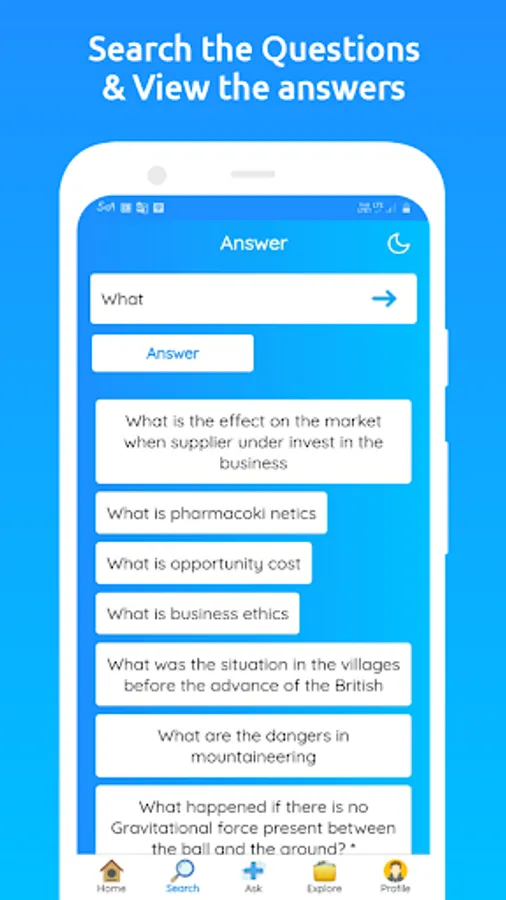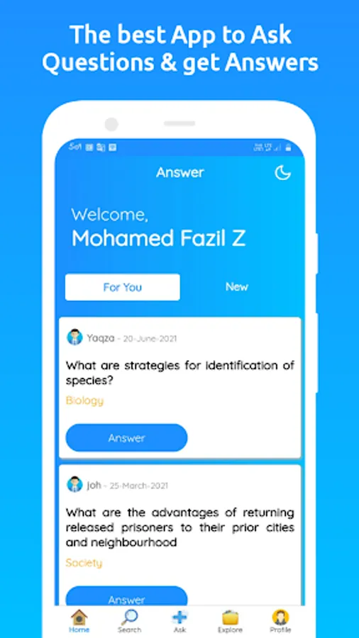 Answer is a simple Q&A Platform. It is a simple and best Questions and Answers app. It was specially designed for learners and students, who can ask their doubts and solve the doubts of others. So, you can help others in their homework. Answer is the best doubt solving and doubt clearing app. It is also called as ask questions, ask answers app. This is the best doubt solving app for students. If you want some help in your homework, then you can ask that question in this app. If someone knows the answer for that question, then they help you by giving his answer. You can also spend some of your time in explore feature, which gives the best questions that has been solved. So, you will learn something new from that. By using answer app, you can spend your time in good and useful way.