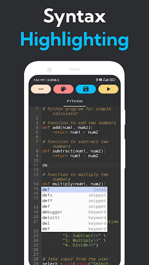 Code Editor is the ultimate app for coding and running PHP, CSS, JavaScript, Python, and HTML codes. Experience lightning-fast performance and precise results that keep you ahead. Its sleek and intuitive user-interface ensures a seamless coding experience. Whether day or night, this app adapts with you, allowing you to work effortlessly at any hour. Explore its incredible features, including syntax highlighting, auto code completion, code suggestion, and code snippet completion for flawless coding. Choose from a variety of themes for personalized day and night modes, and adjust the font size to your preference.