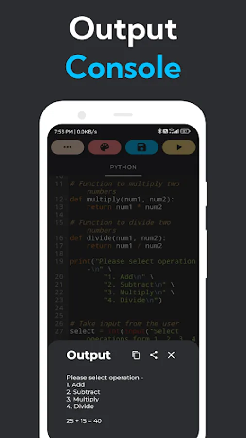 With Code Editor, you have the power of undo, redo, select all, clear all, cut, copy, and paste at your fingertips. Collaborate effortlessly by sharing your code and even the output. Stay organized and efficient as you effortlessly manage and organize your projects.