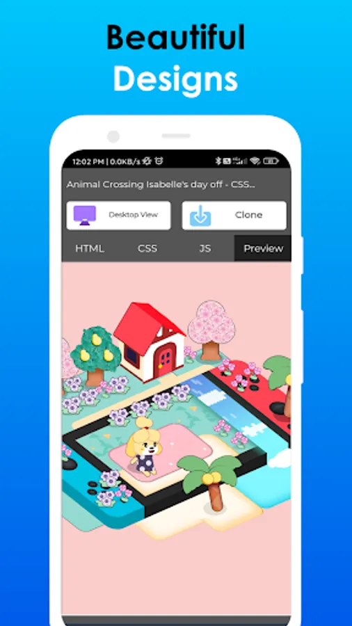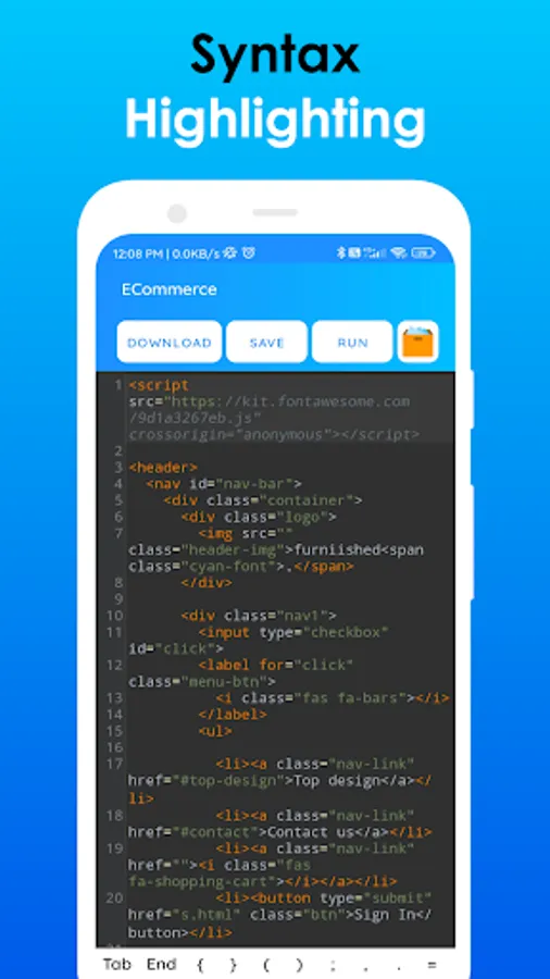 🌟 It has a clean UI, which helps you to work without any inconveniences. There are separate sections for HTML, CSS, JavaScript codes and Preview of the code. You can also view the preview of your code in mobile view and desktop view. This is the best HTML Editor App for Web Development (HTML, CSS & JS) as it supports all the functions that the developers require.