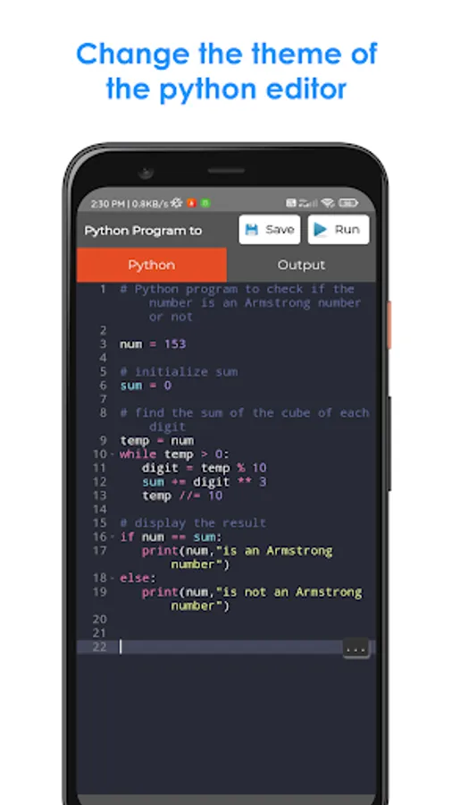 Discover amazing features that enhance your Python coding workflow, including syntax highlighting, auto code completion, code suggestion, and code snippet completion. With support for different themes, effortlessly switch between day and night modes for optimal coding comfort. Customize the font size to suit your preferences.