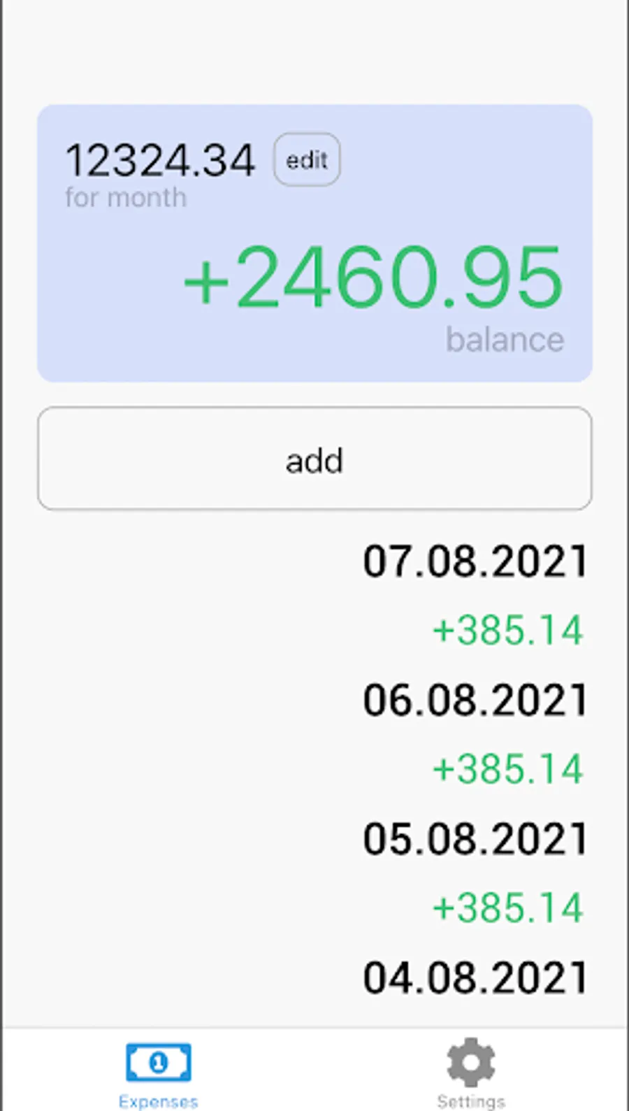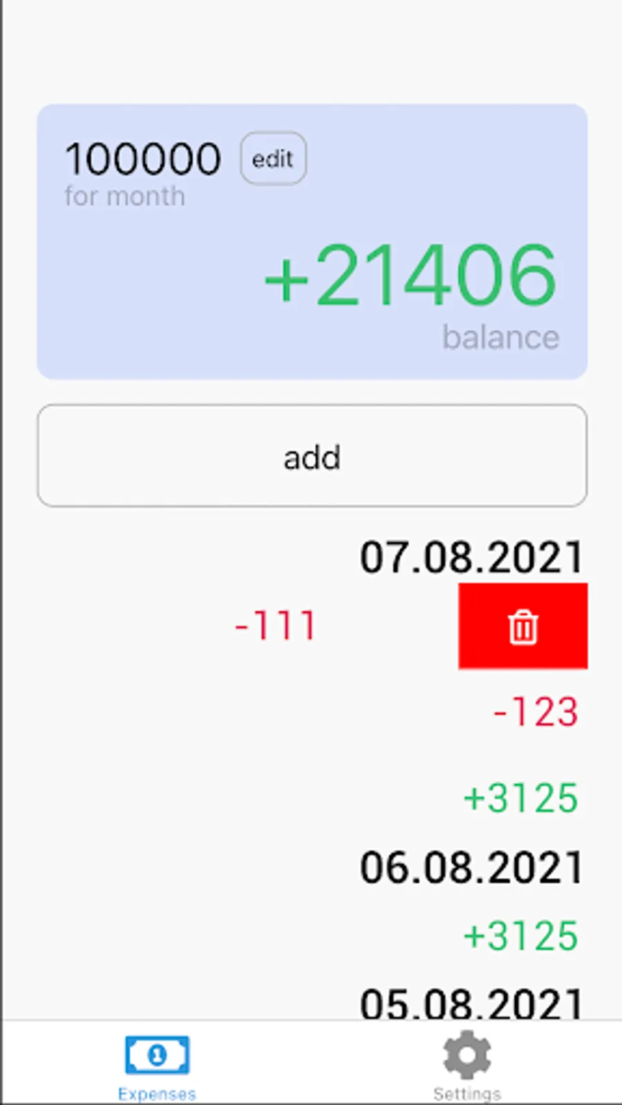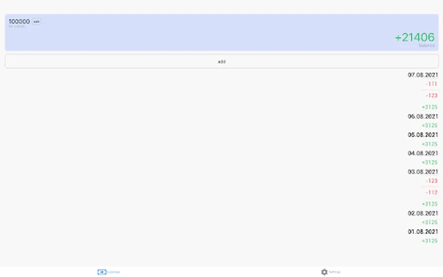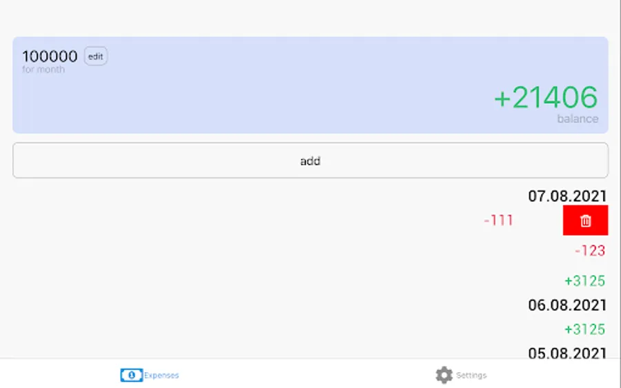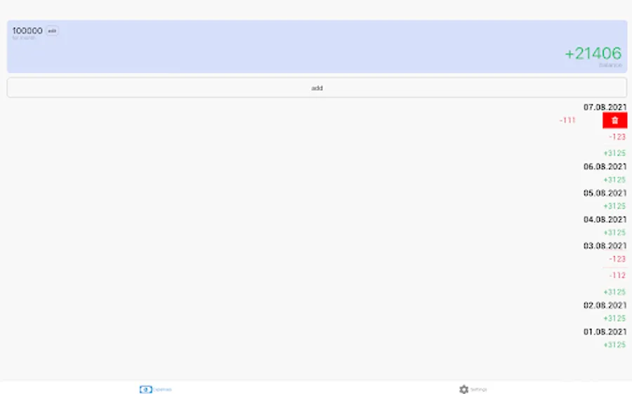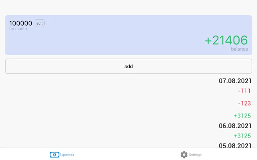 Setup sum for a month and it will divide to days. Daily sum will add to balance every day. Adding expenses will decrease the balance.