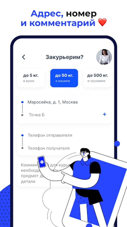 Courier has modernized the sending of the parcel. On the main page, you must select "Customer", after which the profile opens. Fill in the required fields, starting with the choice of weight and courier status: on foot, by car or truck. Further, the courier should know the addresses: point A, point B and, if necessary, points C, D and D. The courier can visit 5 addresses as much as possible. The number of the sender and recipient (s) who will receive the parcel. There was a comment left - that we are carrying other important details of the order. Click on the “Courier” button and you're done! Searching for a courier takes little time.