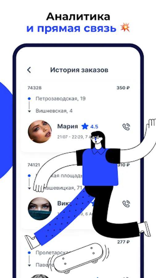 In the tab "My orders" everyone can see the history of their orders: active, successful and canceled. Also remember each delivery, its price, and if necessary, the customer can contact the courier, and the courier with the customer!