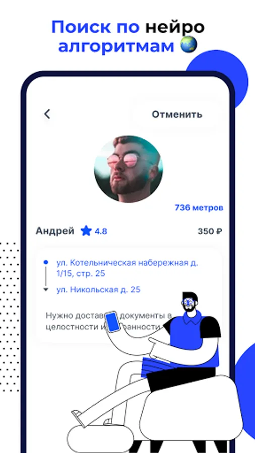 After you find the nearest courier nearby, the order will take effect. You can call the courier if you have questions, as well as cancel the order in case of loss of contact with him or for personal reasons. Payment to the courier is in cash or by card. After successful completion of the order, be sure to evaluate the work of the courier - this review helps to regulate the rating and the work of the courier. Thank you for your attention!