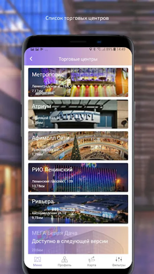 In inMalls application features more than 200 shopping centers in Russia, Belarus, Ukraine and Kazakhstan. Our database is constantly updated and increased, so you can always be aware of new discounts in your nearest shopping center.