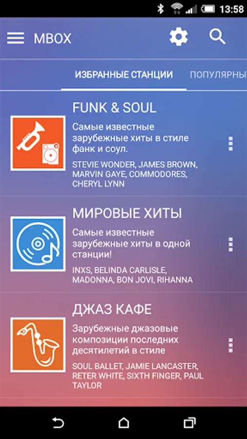 - More than 40 online radio stations for every taste absolutely free: hit songs, instrumental music, rock, pop, Eurochem, jazz, funk, soul, rhythm and blues, rock and roll, retro, 80's disco, disco 90 -x, classical music, music, cinema, Russian rock, romance, dance music, and many others