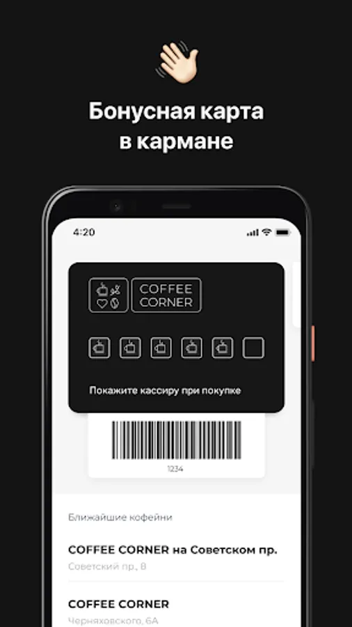 To mark the purchases of coffee and receive gifts, it is enough to present the mobile application at the cash register of the establishment, showing the barcode from the main screen.