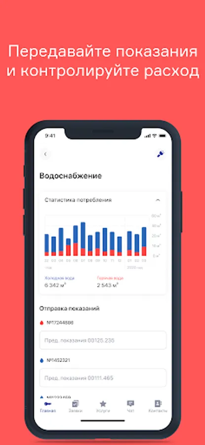 - Submit meter readings. View consumption statistics for various resources, see that the readings were included in the accounting department and will be taken into account in the calculations;