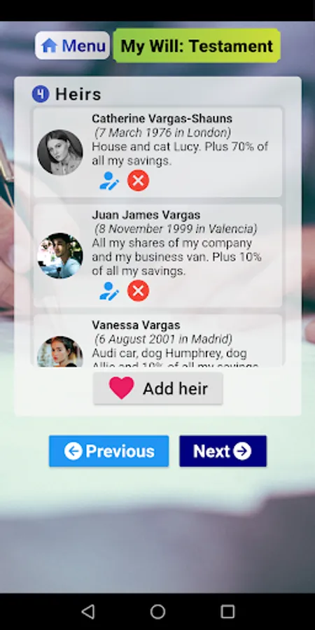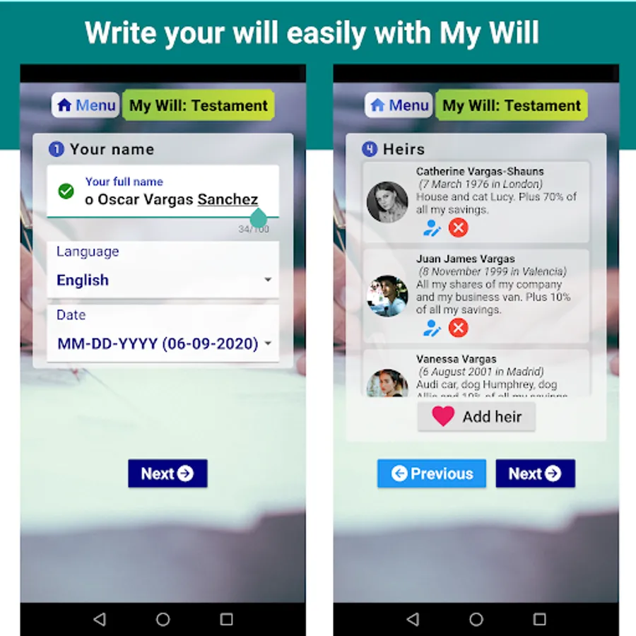 Each country has its own specific rules about inheritance. Consult with your legal advisors and change your will accordingly. NovaPrisma does not give any legal advice and does not take any responsibility for misuse or misrepresentation of My Will.