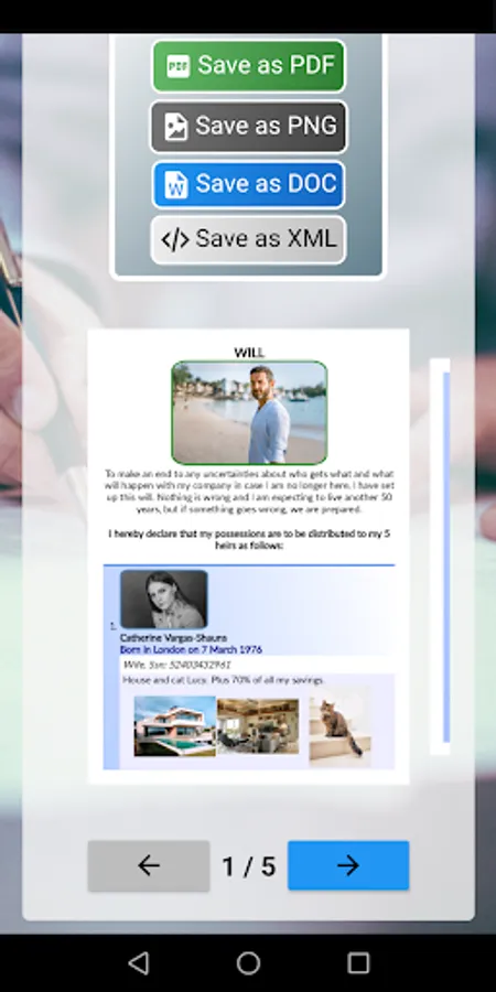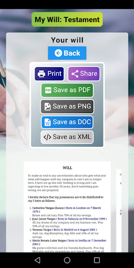 - Print or save your will as a PDF, PNG, XML or DOC file.