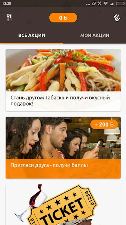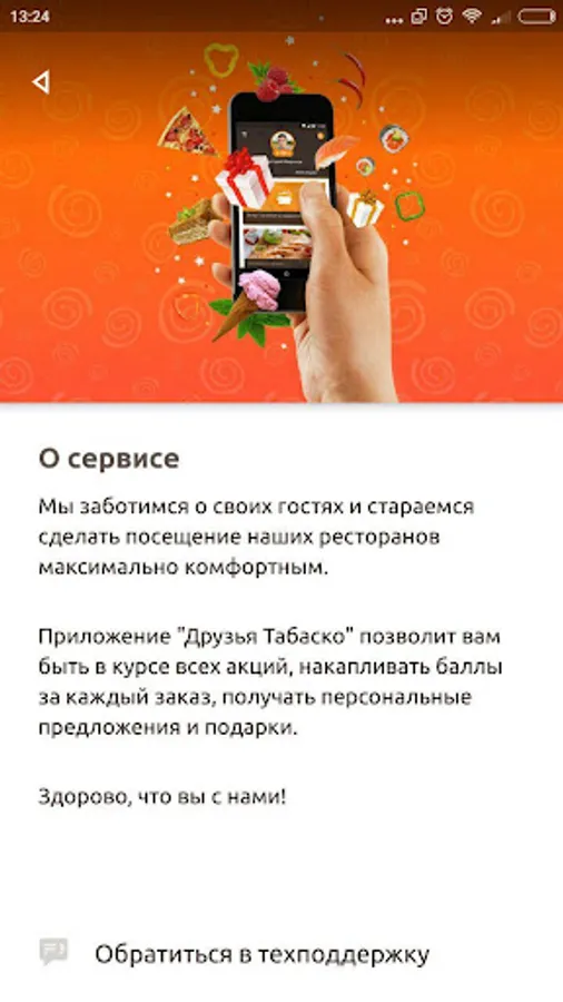 Get the first gift now! Just install the app and log in any restaurant "Tabasco", "Borsch & Fat" or "Monte Cappuccino."