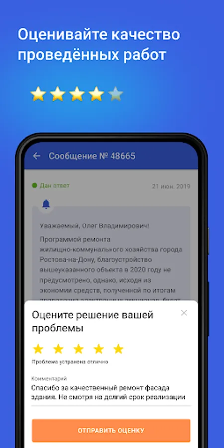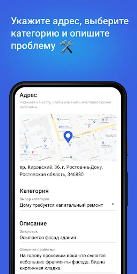 The City Improvement application is a service where residents of Rostov-on-Don inform the authorities about the problems of the urban environment and control their solution.