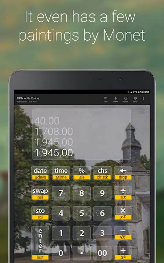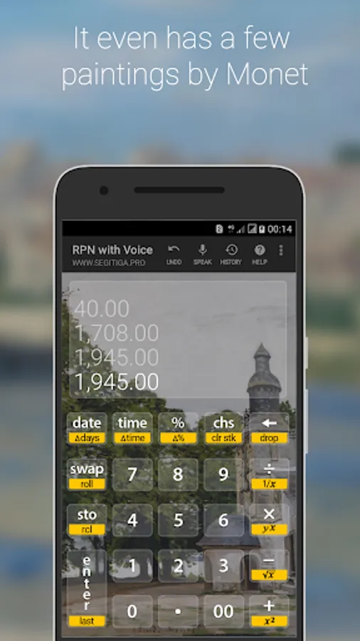 Are you bored with the look of current calculator? Inside the calculator there is a collection of paintings by Claude Monet that you can set as the calculator’s background.