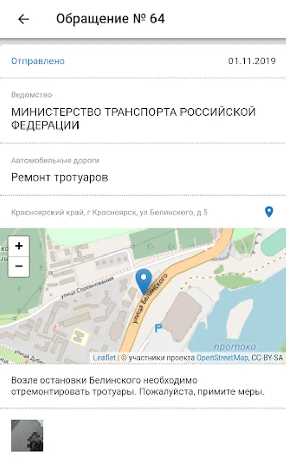 - Send information about an existing problem with an indication of the exact location on the map, a brief description and supporting photos;