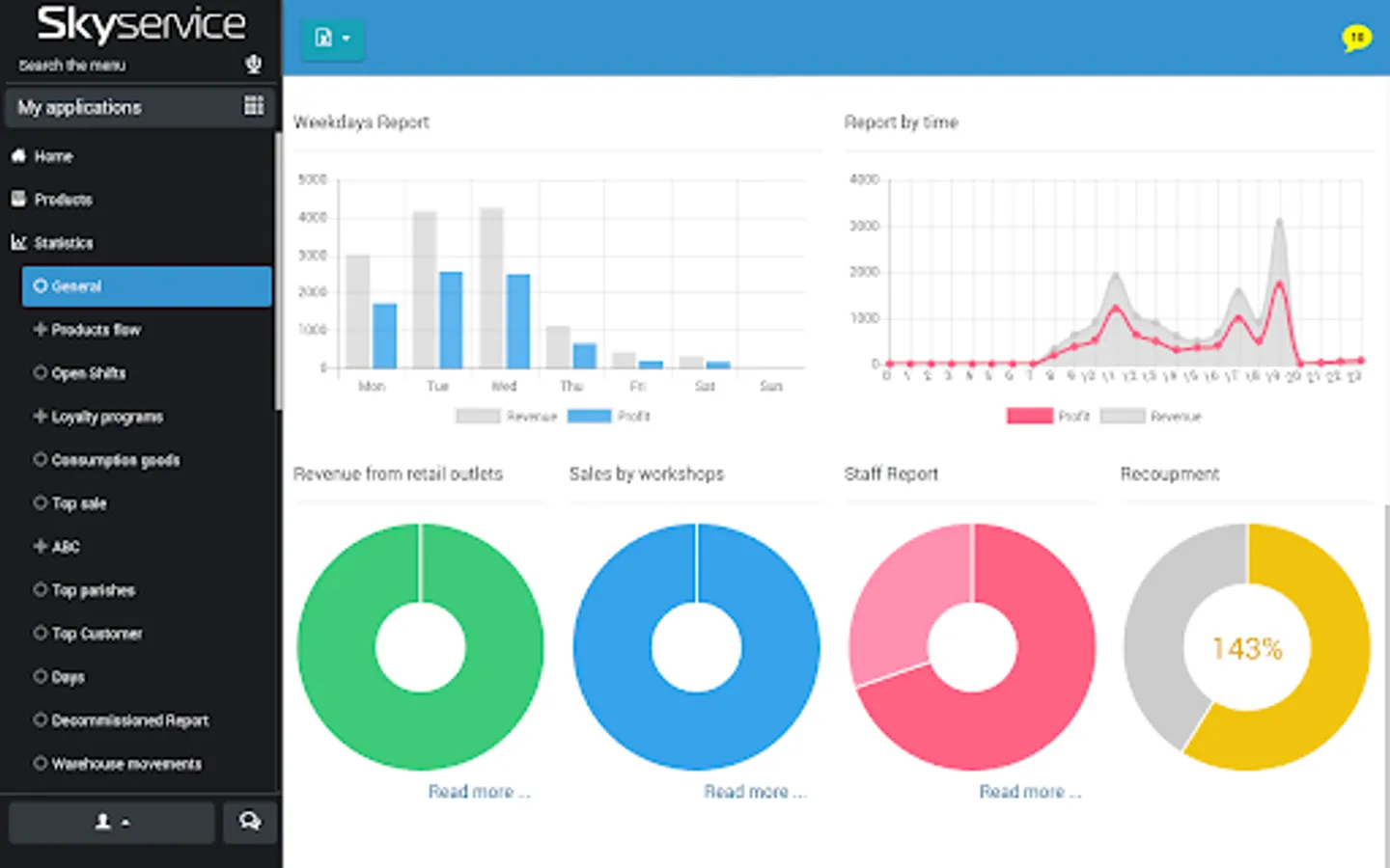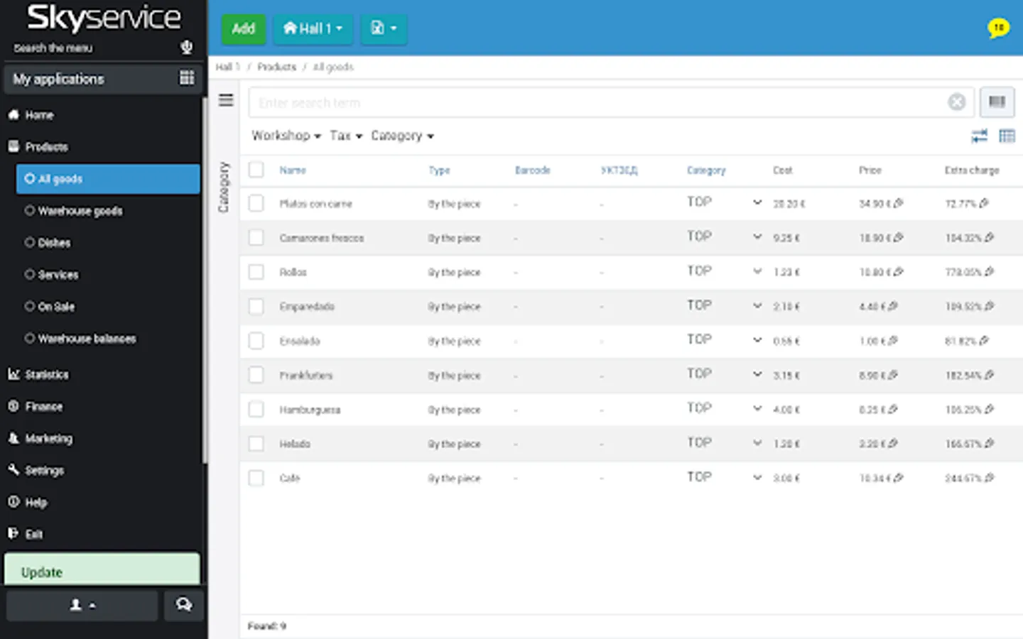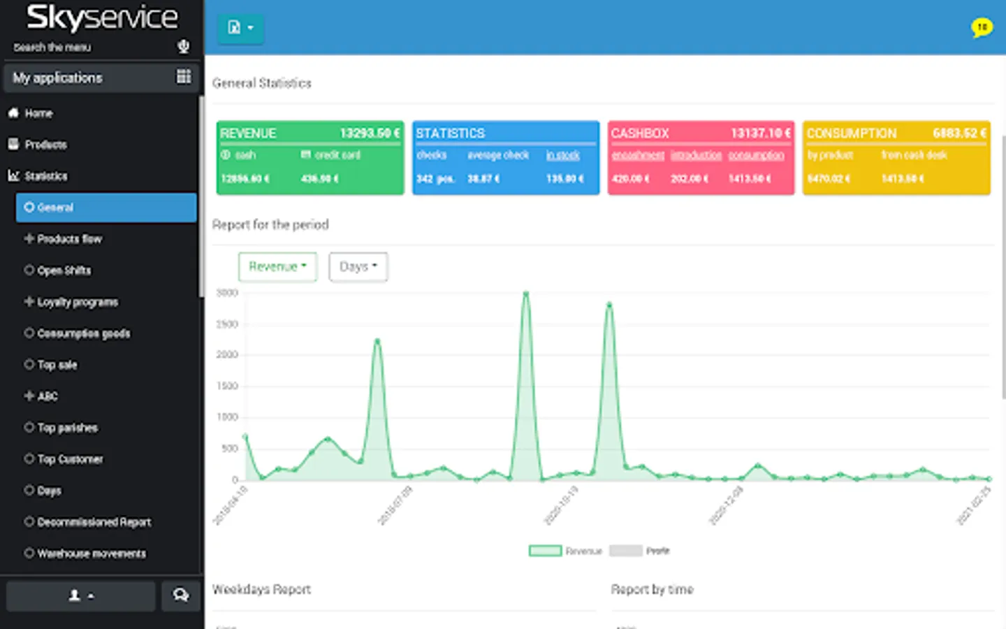 Skyservice POS (POS terminal) - automation of restaurants, shops, mobile coffee shops, street food, fast food and stalls. It allows you to stock inventory, perform monitoring of employees to analyze sales statistics. All data is stored in the cloud and accessible from any device anywhere in the world.