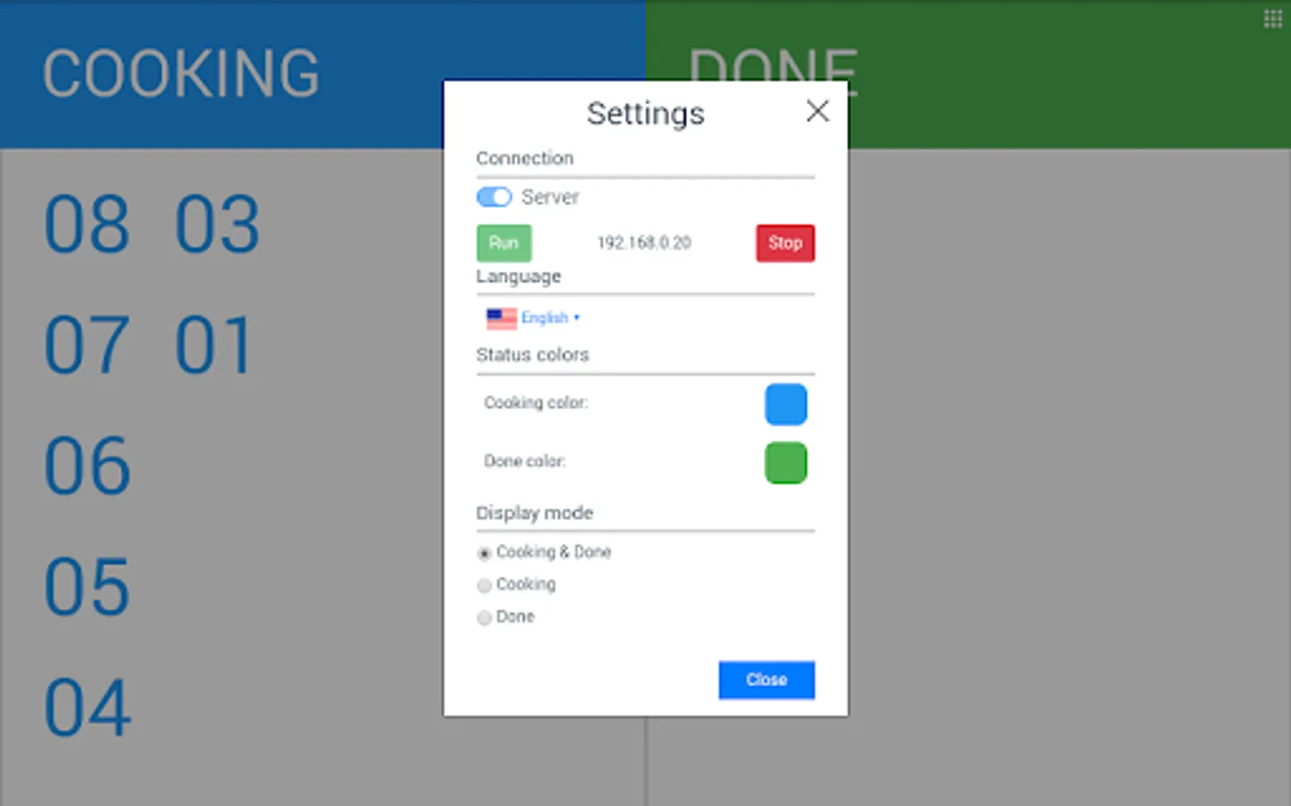 This application is necessary to display the status of order availability for customers on the screen in the hall. The application works inside the local network of the institution and does not require an external Internet channel.