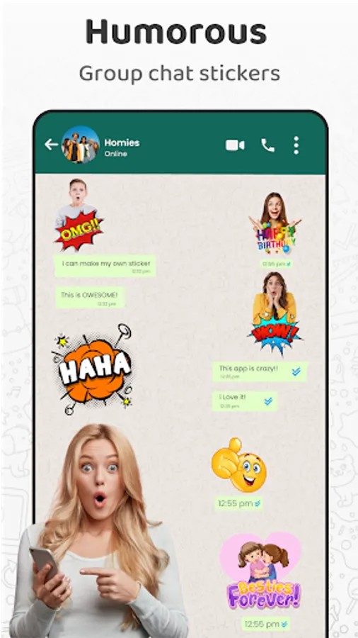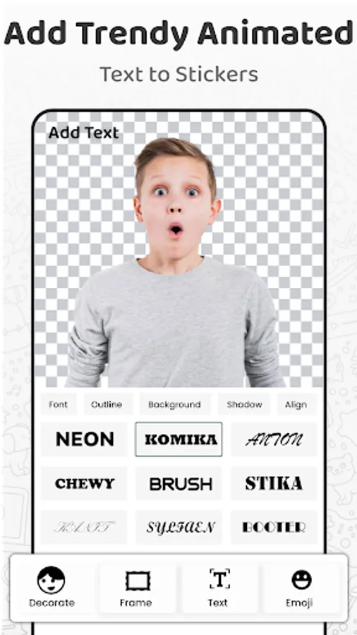 Try sticker animaker Video to create a simple yet emoticon funny sticker for instant use. Select a picture from your phone's gallery, edit or crop the picture, remove the background, add text or filters to the sticker, and click the save button. Go to WhatsApp and enjoy instantly made stickers.