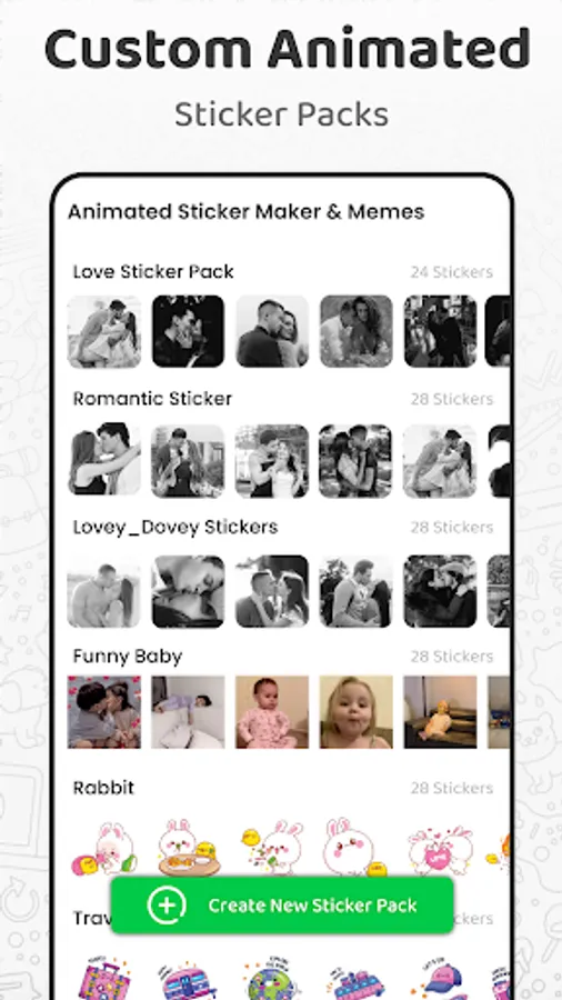 Some of the packs are already available in this emoticon sticker animaker app which includes these categories: memes, movies, love, kids, comics, rabbit, travel, text, etc.