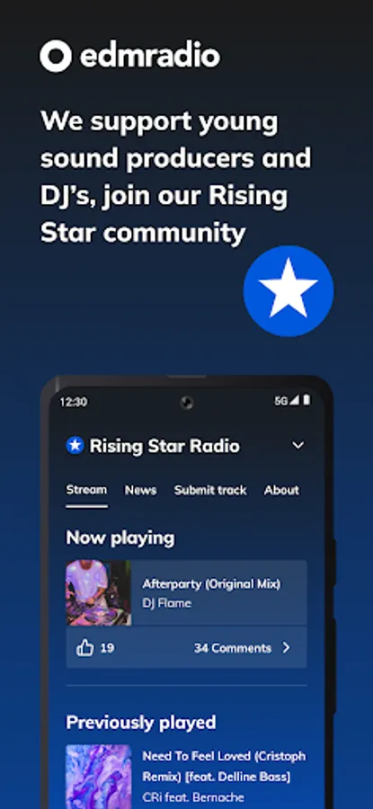 For Rising Stars - we offer sound producers the opportunity to publish their tracks on our platform because we know how hard to be heard nowadays in this digital world; that's why we support electronic dance music producers.