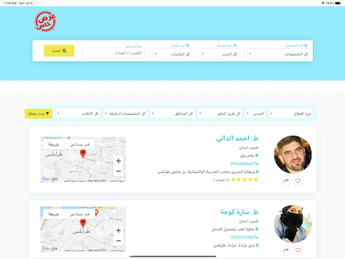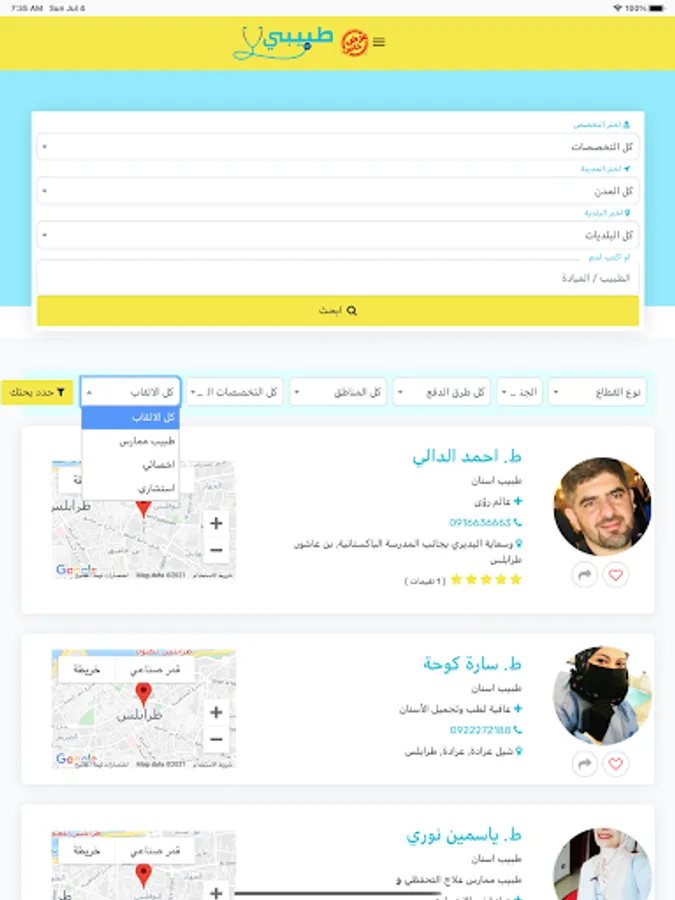 Tabibi Pro provides functionality to search doctor near by you with many search create areas and filters like specialist, generalist, dentist to give you more accurate results, also the Rating and Review functionality display you the top rated doctors at top of the results.