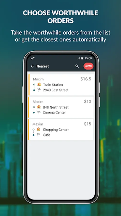 Filter orders by rate and destination to select the most suitable orders for you from the list. Alternatively, you can enable a mode in which our service offers you the nearest orders automatically, allowing you to complete them one by one. This lets you earn more while spending less time and fuel.
