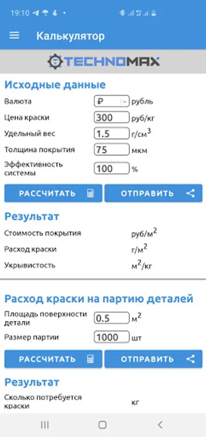 The calculator also helps you determine the amount of paint required to paint a batch of parts with a known surface area, which is very useful when planning purchases in production.