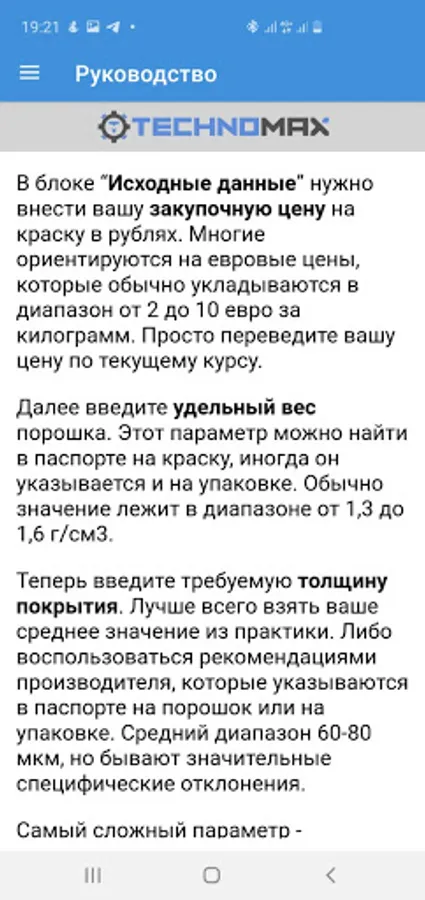You will need to enter the price per kilogram of paint, specific gravity, and coating thickness. And the application will give all the necessary parameters.