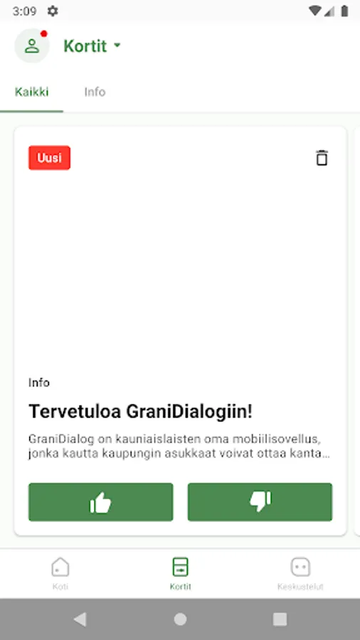 GraniDialog is a private mobile application by the citizens, through which city residents can comment on the city. GraniDialog is a pocket-sized engagement channel for everybody in your pocket, making it easy to hear your voice! Take part, give feedback and stay on the map with current affairs!
