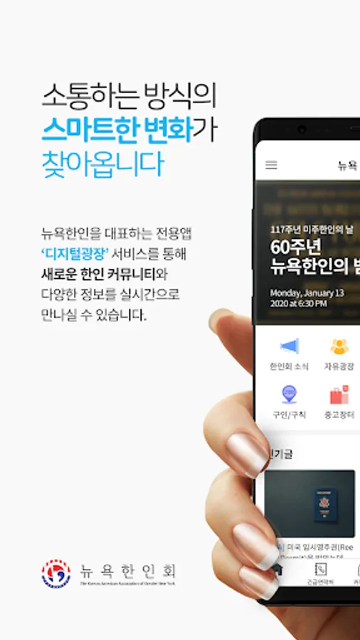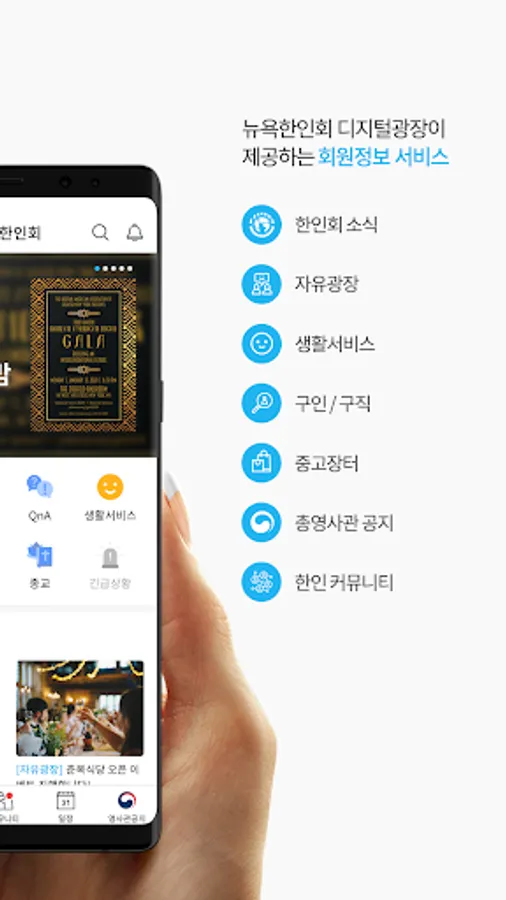 KAAGNY App. provides services for improving the living information and mutual solidarity of New York Koreans such as living convenience and emergency, New York life, travel and accommodation QnA, and communicating with 2nd and 3rd generations.