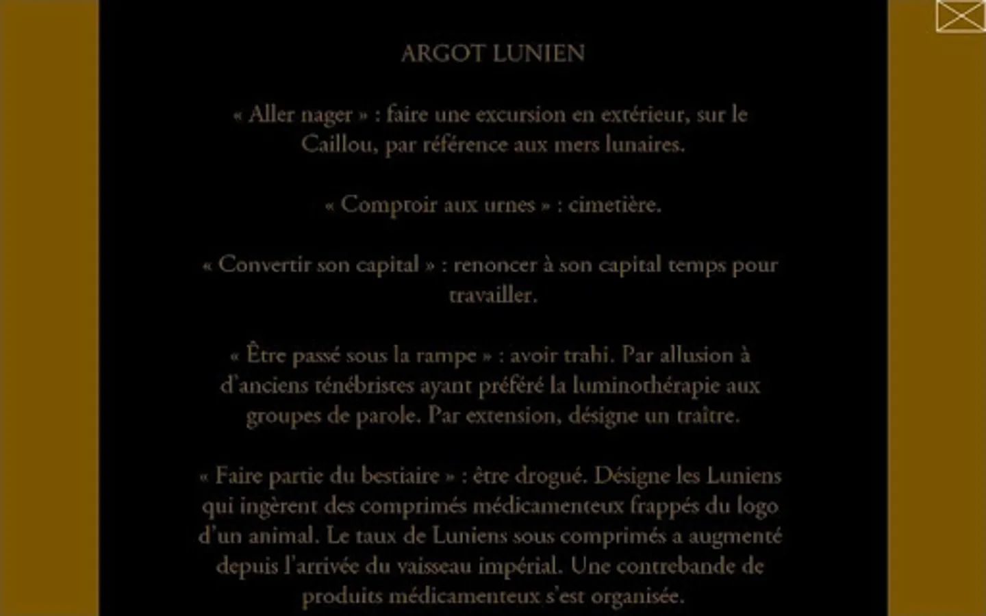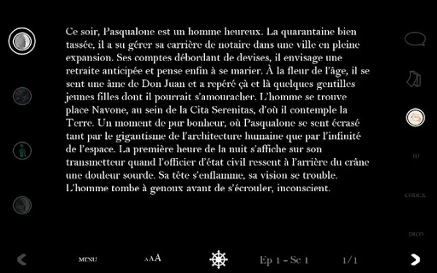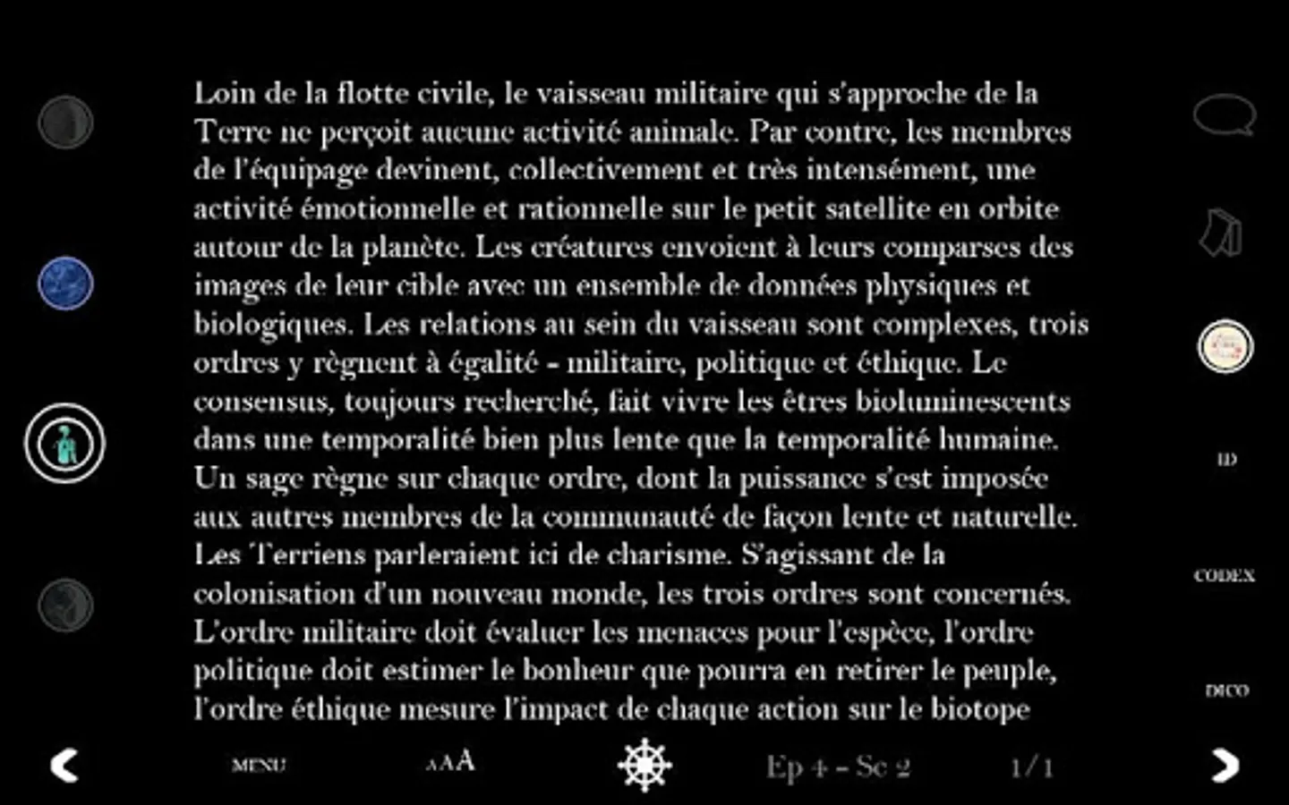 The android application designed for tablets and smartphones, includes over a hundred pages of reading over 8 episodes, themselves divided into scenes. Interactive navigation is user friendly and allows the user to easily navigate between the narrative and audiovisual entertainment.