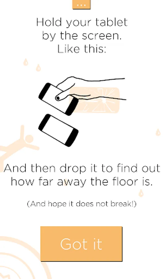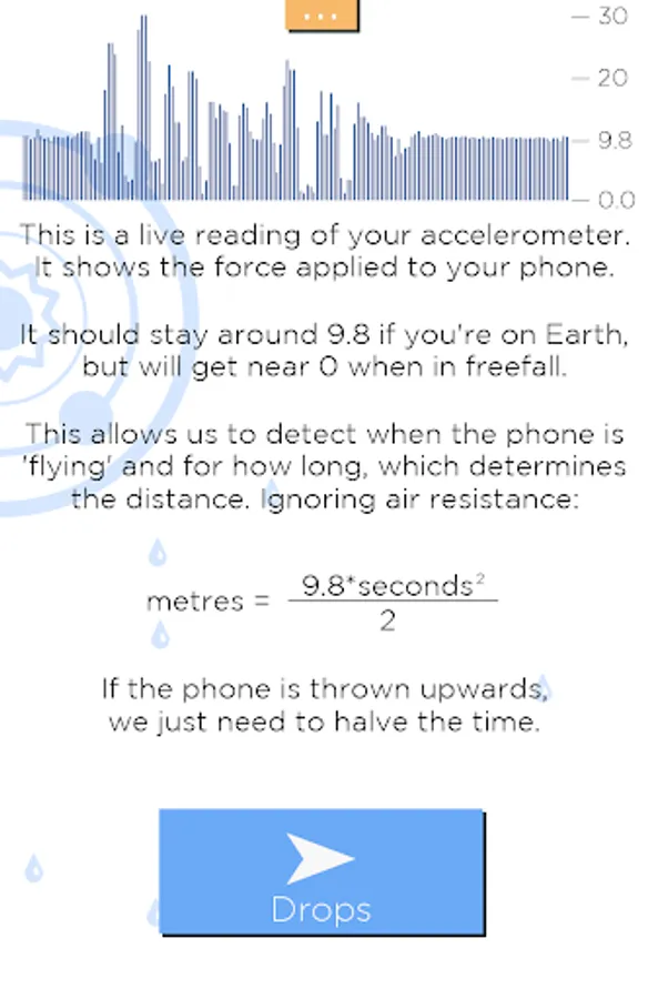 This device shows the forces applied on the phone, which should stay around 1g (if you’re on Earth!), but will get near 0 when dropped (or launched) in free fall.