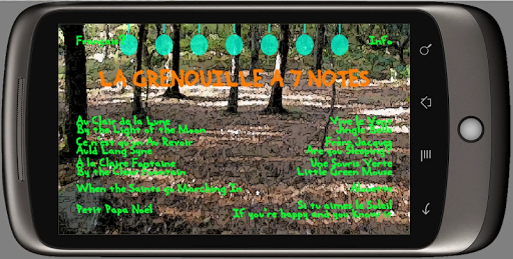 "By the Light of the Moon", "When the Saints Go Marching In", "Auld Lang Syne", "By the Clear Fountain", "Petit Papa Noël", "Jingle Bells", "Are you Sleeping?", "Little Green Mouse", "Alouette" and "If you're happy and you know it".