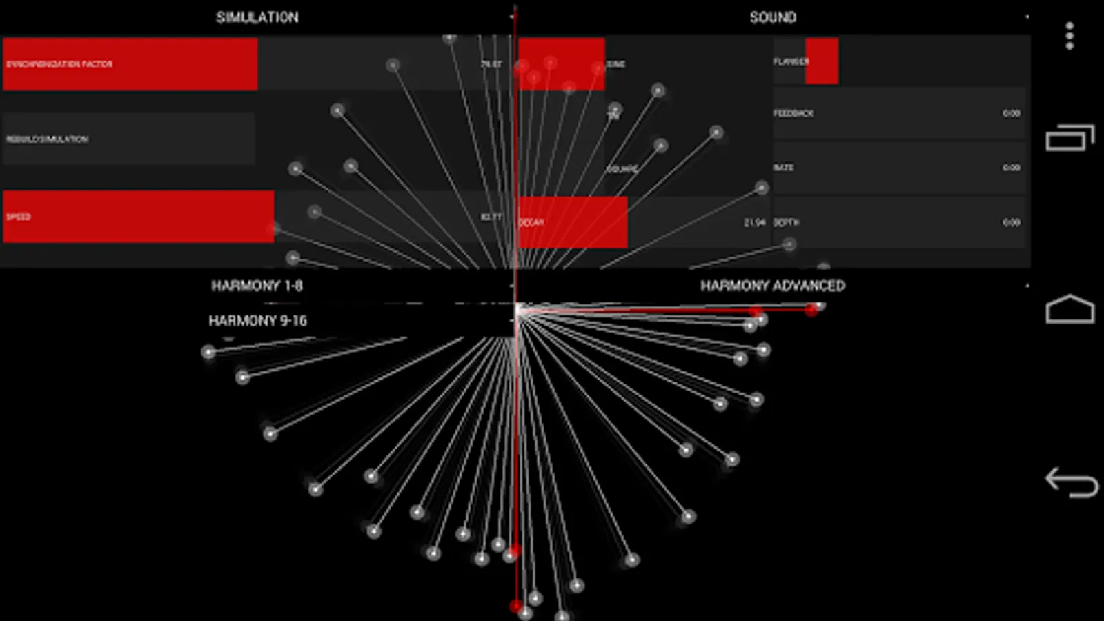 Parameters of the simulation such as synchronisation or travelling speed are tweakable. Sound parameters will enable you to explore several harmonic mapping from consonant to most 'bizarre' ones.