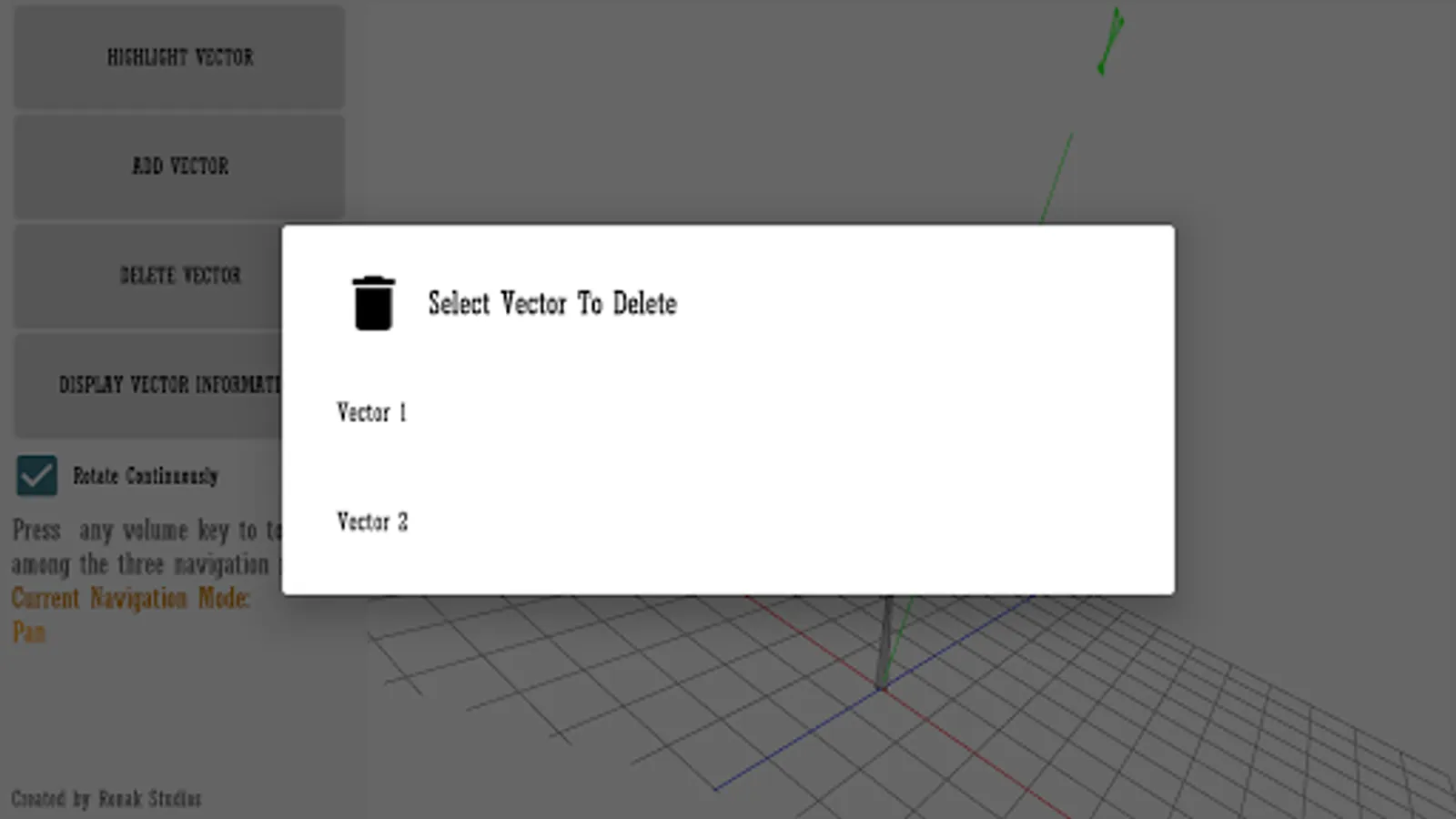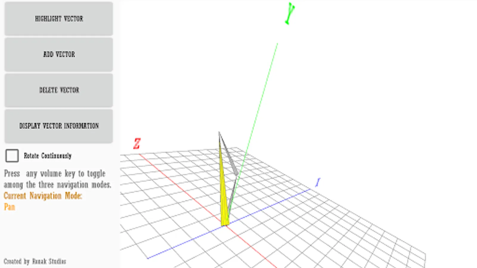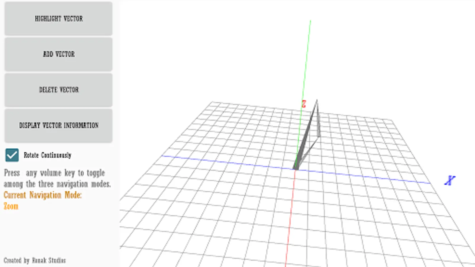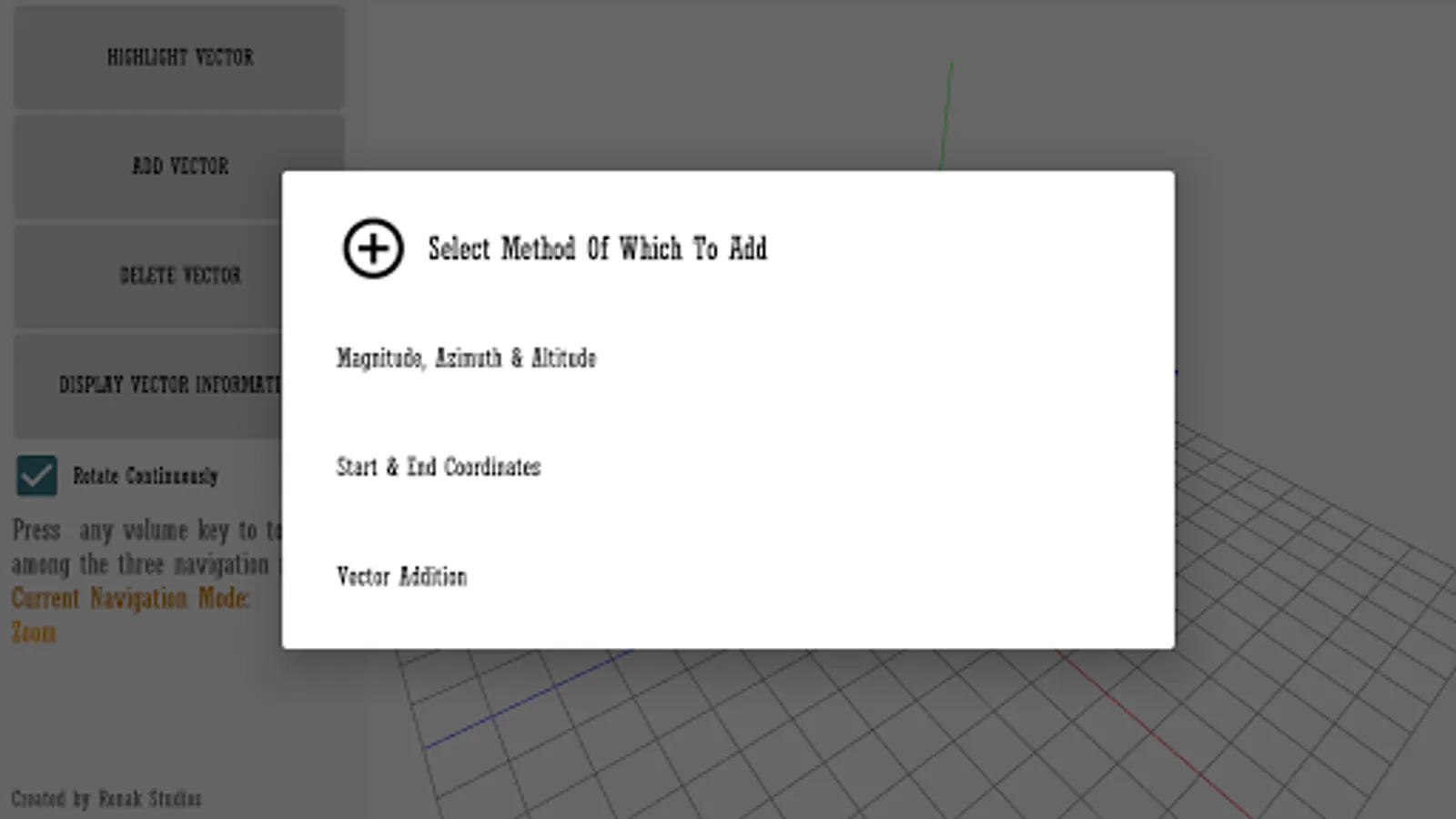 Using OpenGL, this app graphs and adds vectors using an azimuth-altitude-magnitude system. The app also gives all the information you would ever need to know for each vector. Note: Azimuth is counterclockwise about the x-axis and Altitude is counterclockwise about the z-axis. The altitude is the inverse of the elevation of the vector.